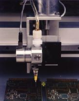 this category - the diaphragm, spool and needle. With the diaphragm valve (Fig. 3b), the material dispensed is controlled by a plunger acting on a diaphragm, which in turn activates a poppet to open and close the flow of material to the tip. The longer the poppet is in the open position and the higher the pressure on the material, the greater the quantity dispensed. Pressure typically is applied through an electric solenoid or motorized device. When the poppet returns to the closed position, the diaphragm pulls back from the seal, causing a "suck back" action that provides a sharp cutoff of material. The constant pressure at the material inlet and "suck back" action give the diaphragm valve much higher accuracy than the basic syringe valve. The diaphragm valve dispenses beads and fills in medium-precision volumes but has less accuracy when dispensing dots (Fig. 4). It has limited applications and typically works best with low-to medium-viscosity materials such as solder masks and conformal coatings. The diaphragm valve is most widely used to dispense lines of solder mask for wave solder applications. |